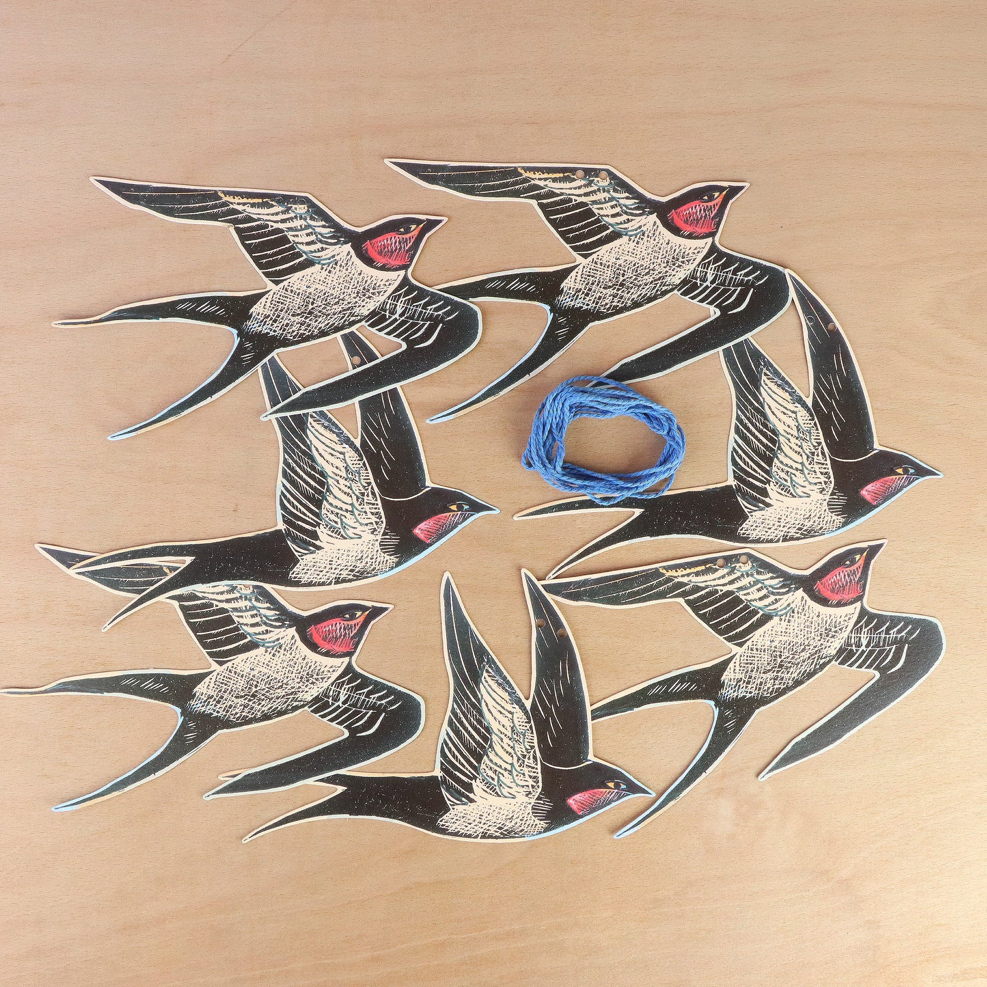 Contains 7 paper swallows and is packed in a wallet with coloured twine to thread and display.