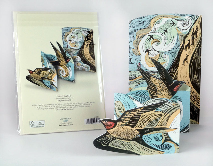 A lovely card to send to countryside lovers and bird watchers; the die-cut Art Angels Angela Harding Cornish Swallows Concertina Card can be sent as a birthday, thank you or just because card. The card folds out to reveal magnificent swallows swooping over the Cornish coastline. 13.5 x 20.5cm when closed