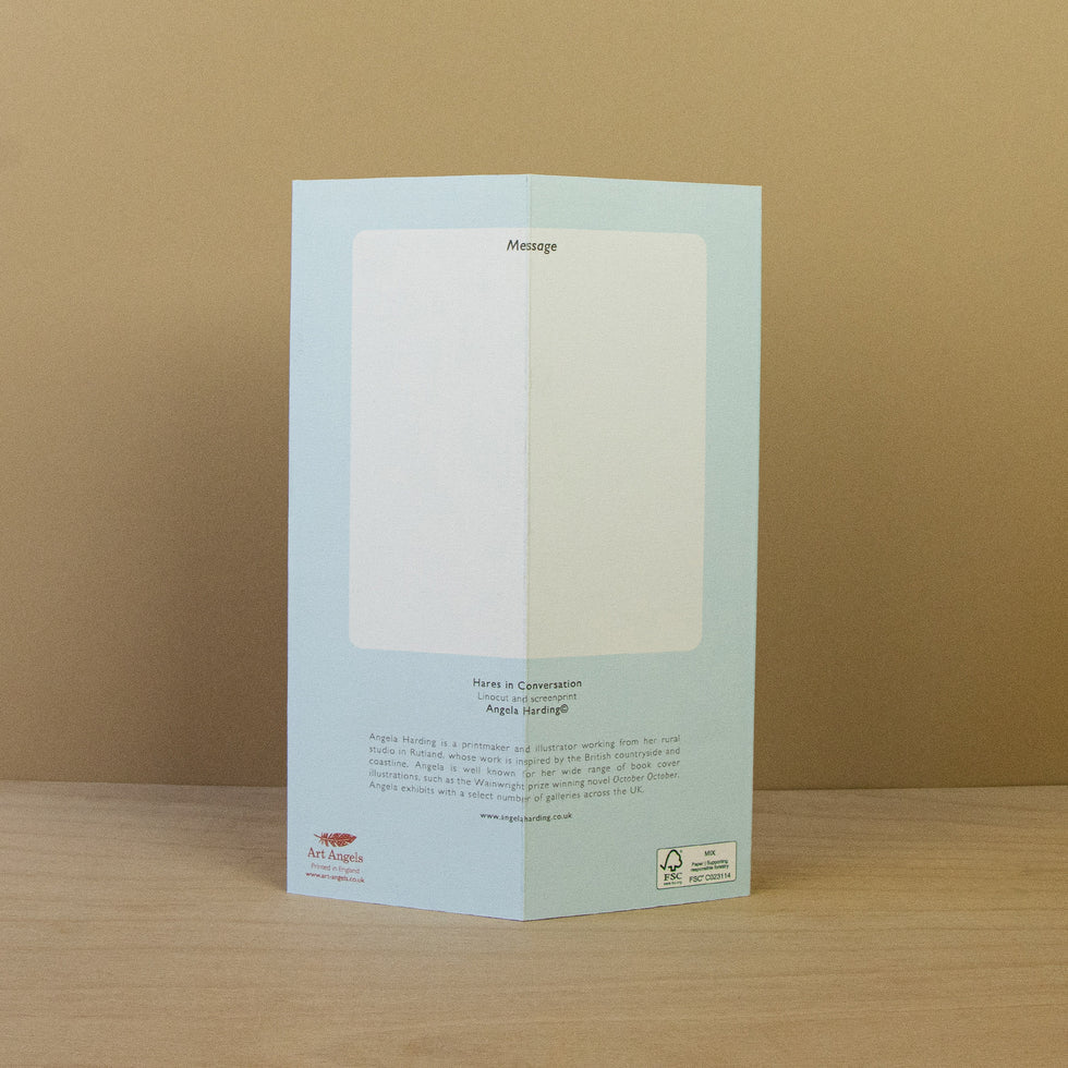 A lovely card to send to countryside lovers; the die-cut Concertina Card can be sent as a Christmas, birthday, thank you or just because card. The card folds out to reveal majestic hares in a Winter Woodland in conversation with Woodland Birds.